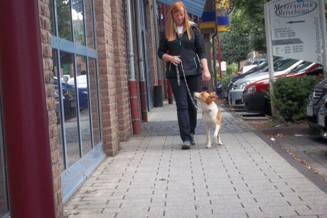 Bevor wir uns der Ausbildung zum verkehrssicheren Familienbegleithund widmen, hat eine Überprüfung des Gehorsams in einer Stadtzone stattgefunden. Die Prüfungsordnung und das Bewertungspunktesystem wurden ausführlich mit der Hundehalterin besprochen. Stramme Leine, Kommandowiederholung oder verzögerte Ausführung der Kommandos bei plötzlicher Ablenkung, ergibt Punktabzug, Korrekturen an der Leine führen zum Ausschluss der Prüfung. Des Weiteren muss für Bestehen dieser Prüfung eine Mindestpunktzahl erreicht sein.