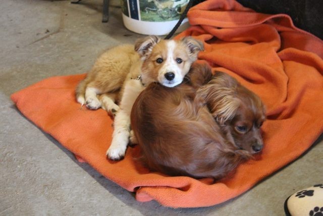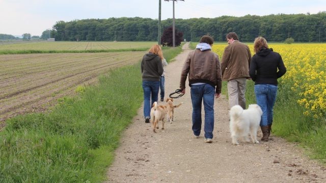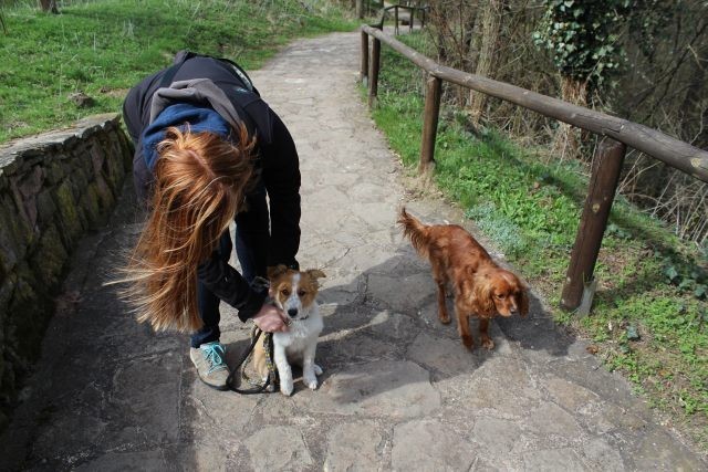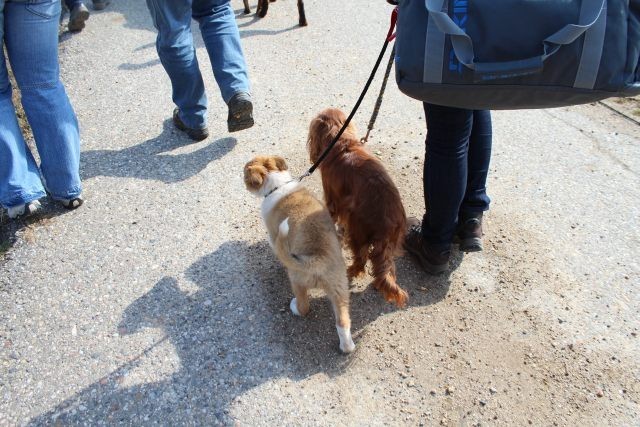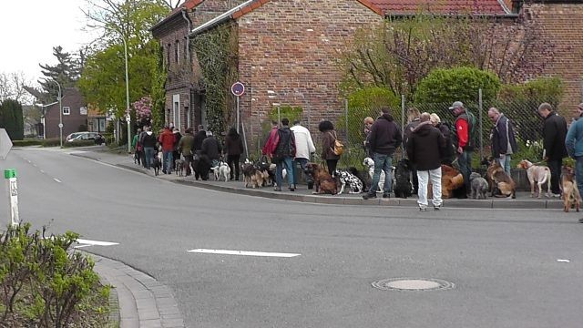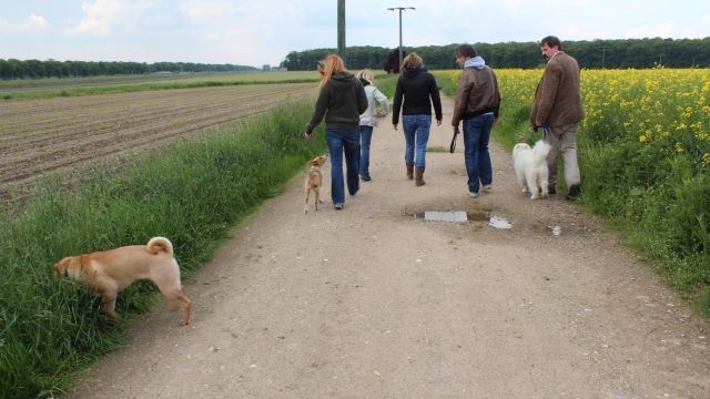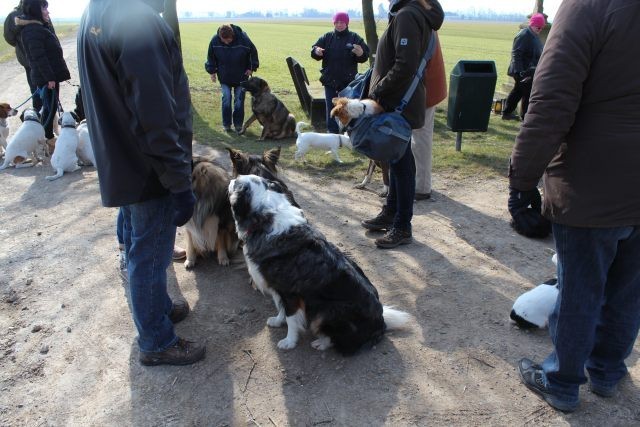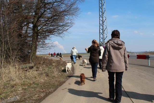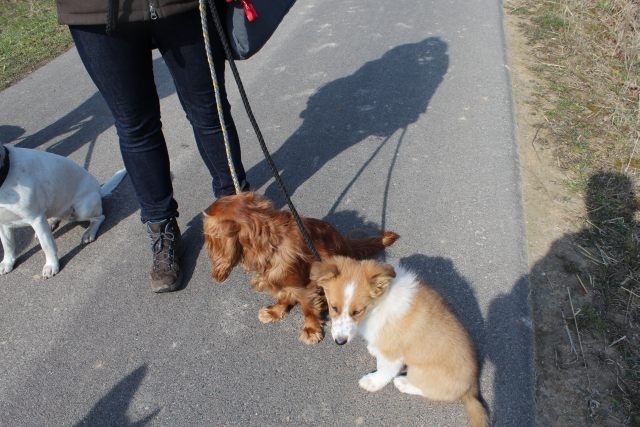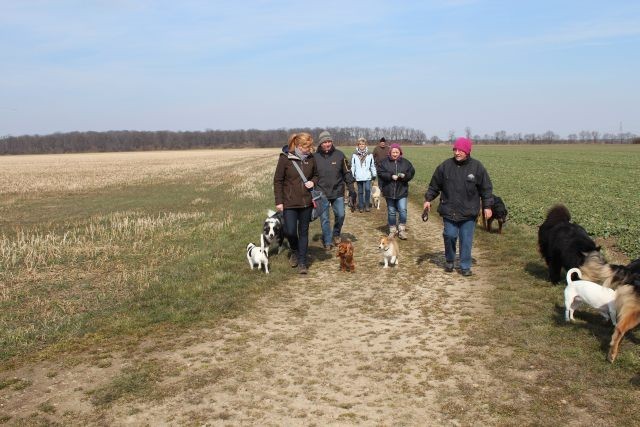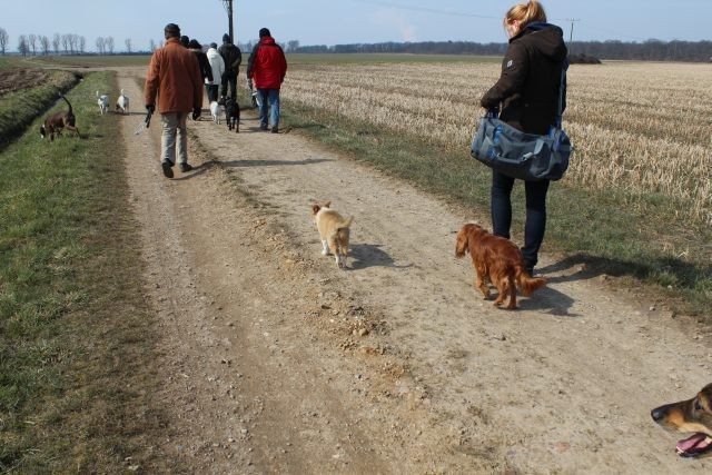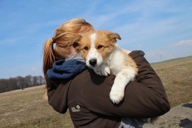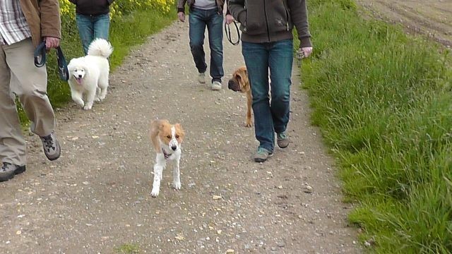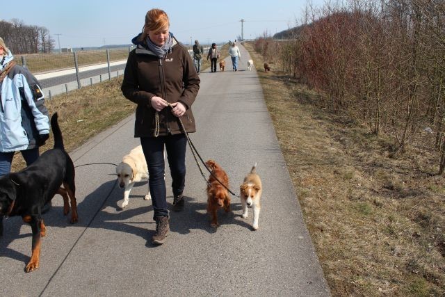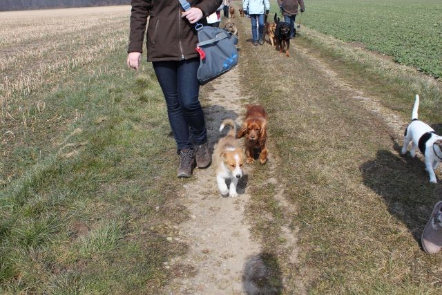 Milli und Vince nehmen an der Osterwanderung der Hundeschule teil. Der gesamte Weg ist natürlich noch zu weit für die kleine Milli und muss zwischendurch getragen werden. Für die Prägung eines Welpen sind positive soziale Kontakte zu fremden Hunden äußerst wichtig. So erhält sie ausschließlich nur mit erzogenen und ausgeglichenen Hunden Kontakt, unerzogene Hunde werden im Alltag von ihr ferngehalten.