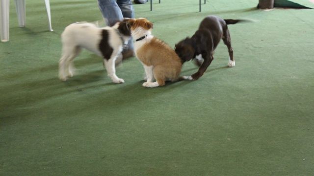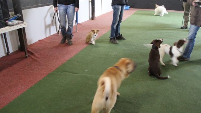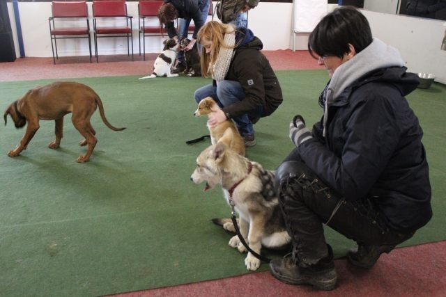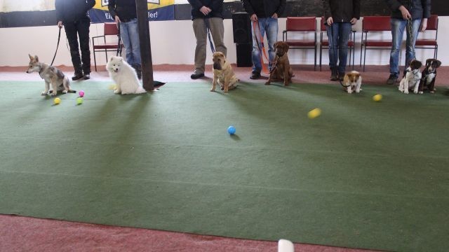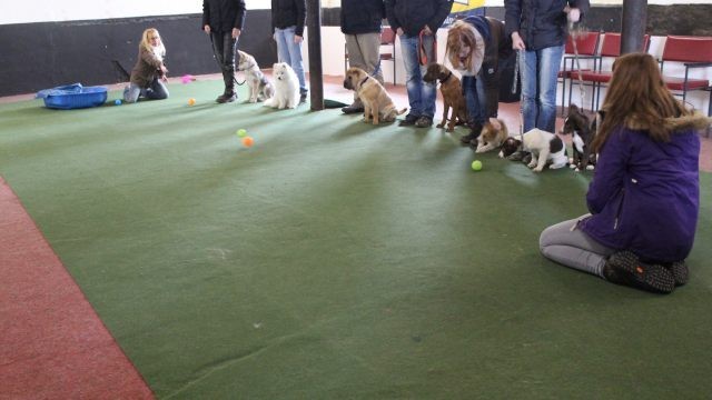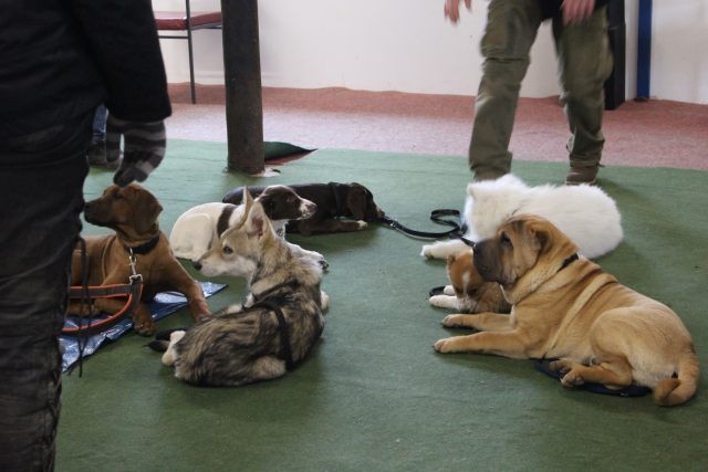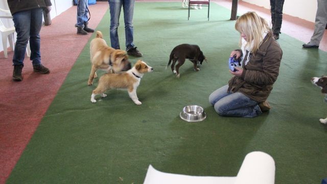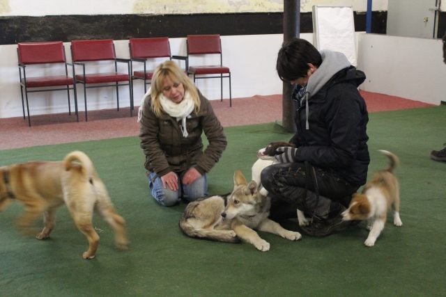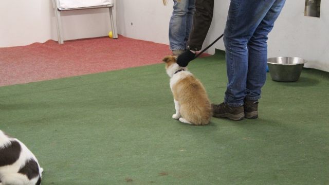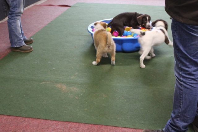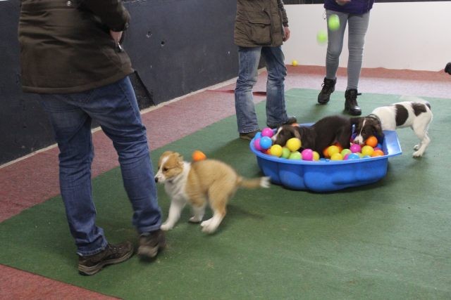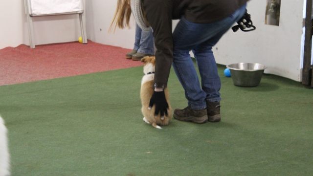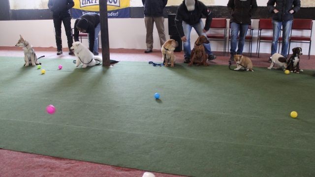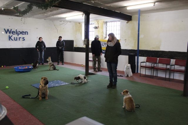 Milli wird in eine bestehende Welpengruppe integriert. Die Gruppe muss überschaubar bleiben um effektiv und konzentriert handeln zu können. Die älteren und größeren Welpen haben bereits gelernt mit einem jüngeren Kollegen behutsam umzugehen. Eine Trennung nach Größe und Welpenalter erübrigt sich somit.